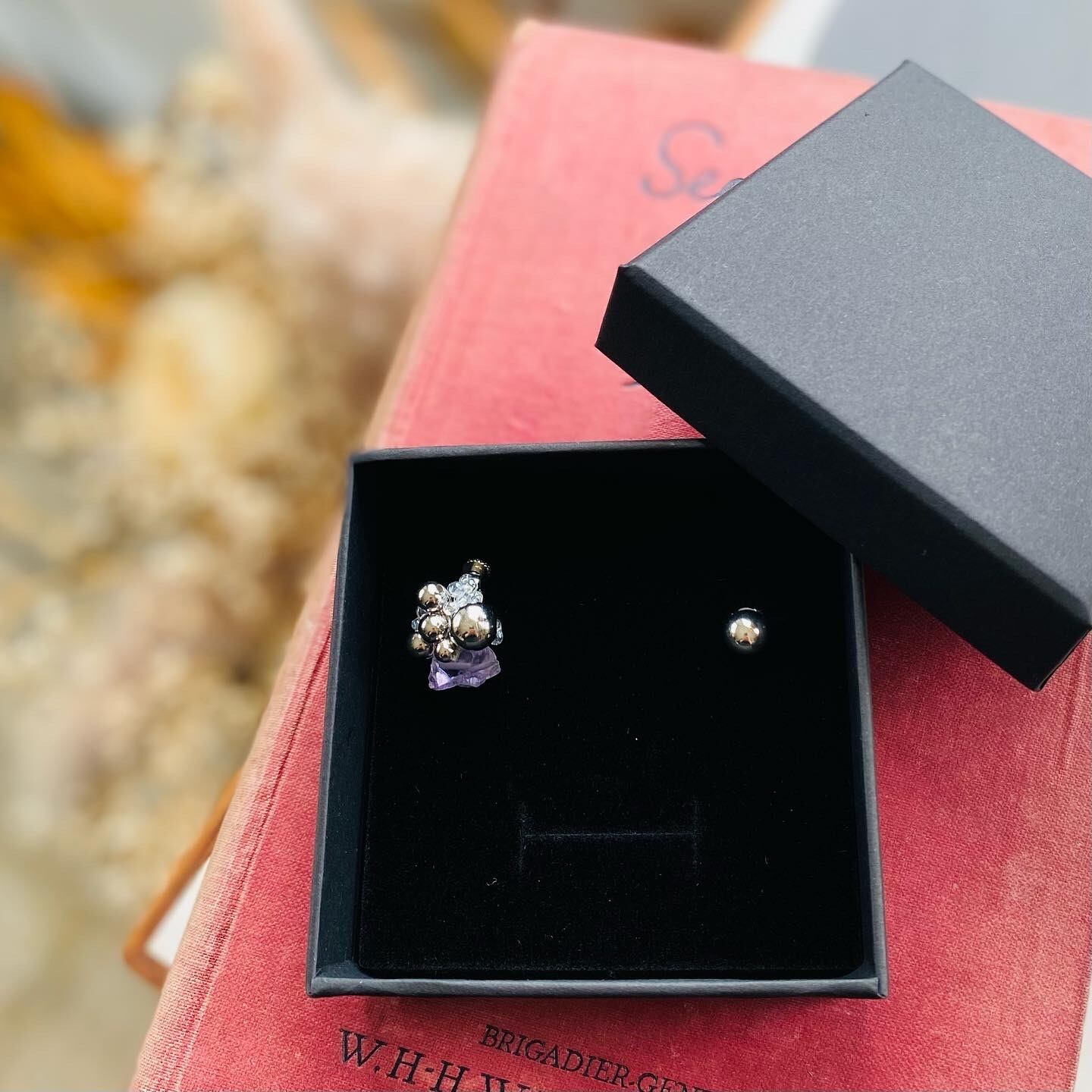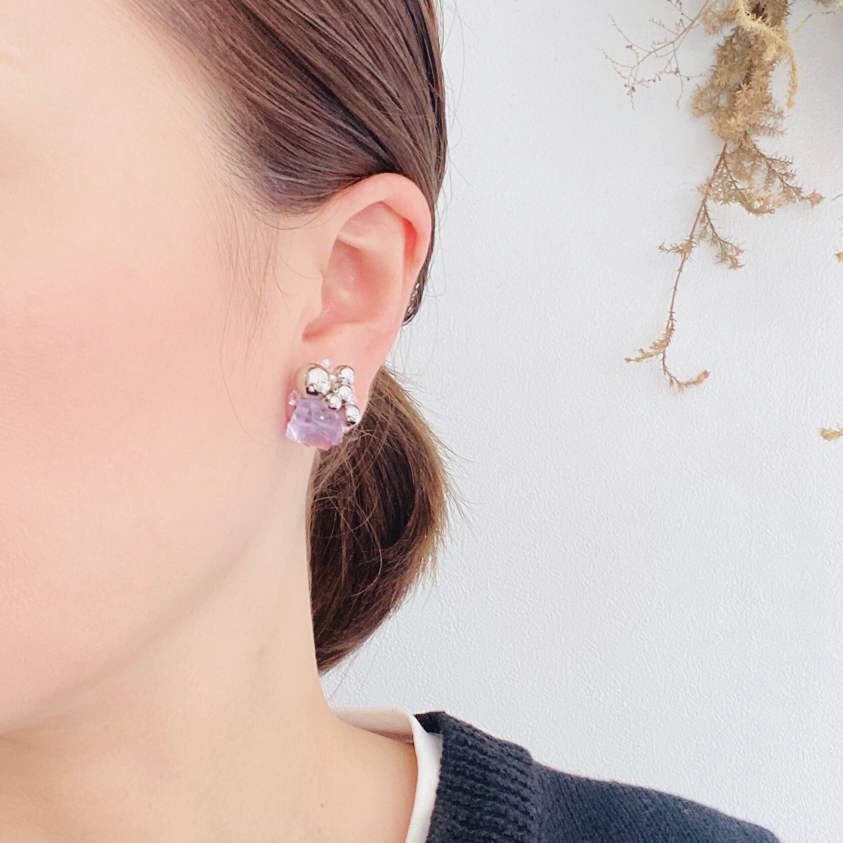 アメジストやシルバーパーツ、ガラスビーズで表現しました。