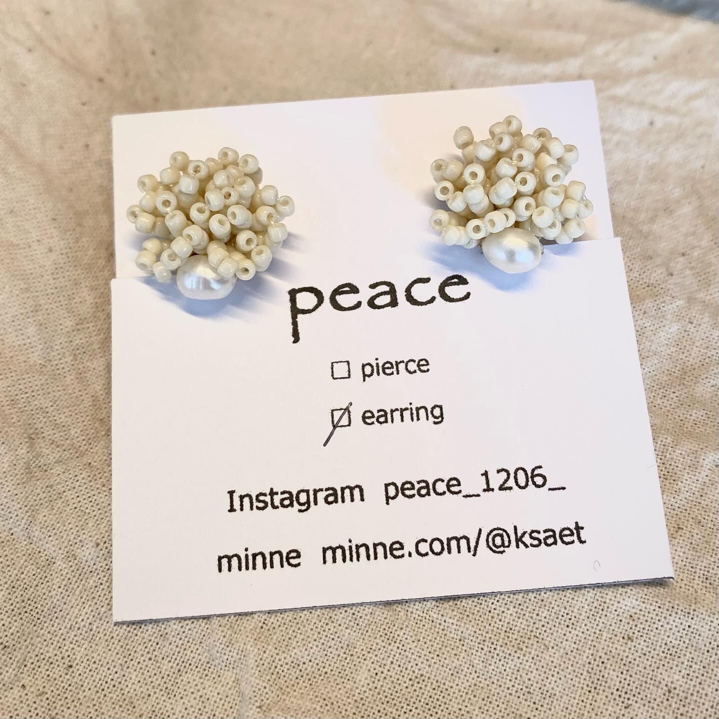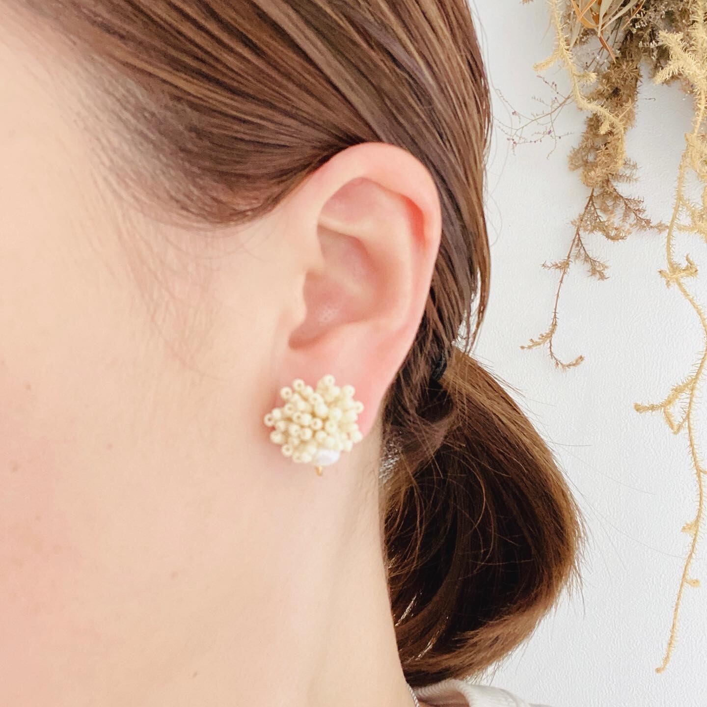 オフホワイトのビーズと淡水パールの組み合わせで、カジュアルから綺麗め系にも合わせやすいデザインになってます。
